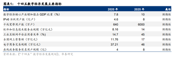 1月12日,国务院印发的《“十四五”数字经济发展规划》,明确了数字经济未来五年的发展方向,总体要求与目标:到2025年,数字经济迈向全面扩展期,数字经济核心产业增加值占GDP比重达到10%,IPv6活跃用户数达到8亿户,千兆宽带用户将达6000万户,软件和信息技术服务业规模将达到14万亿元,工业互联网平台应用普及率达到45%。