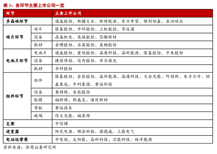 当前行业加速增长确定性强,产业链技术持续创新优化,技术领先企业有望加速扩展,市占率持续提升,并获得高于行业平均的盈利水平,业绩有望超预期。浙商证券建议关注5条主线:1)一体化龙头企业,业绩有望超预期(隆基股份、晶澳科技、天合光能);2)硅料供需仍偏紧,价格有望维持较高水平,龙头业绩确定性强(通威股份、大全能源);3)受益光伏+储能双轮驱动的阳光电源、锦浪科技、固德威;4)格局较好且长期成长确定性强的胶膜龙头企业福斯特、海优新材;5)其他环节的优质龙头企业,中信博、福莱特等。