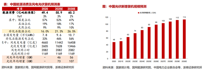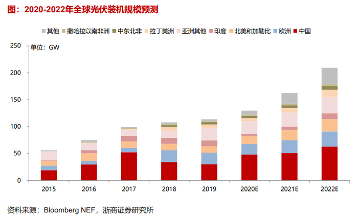 其次是因为平价光伏的时代已经来临,产业迎来了高速增长期。当前国内光伏项目度电成本已降至0.25-0.35元/kWh,光伏已在国内约2/3地区实现平价。全球范围内,光伏已在多数国家和地区成为最廉价能源。未来随着光伏装机成本持续快速降低,产业即将迈入高速增长期。中性预期下,2021-2022年,全球光伏新增装机规模分别达到163/209GW,其中,中国市场光伏新增51/63GW ,十四五/十五五期间,我国预计光伏年均新增装机73/107GW。