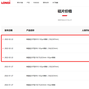 2月22日,光伏龙头隆基股份再次上调单晶硅片价格,单晶硅片P型M10 165μm厚度(182/247mm)¥6.50,上调1.88%;单晶硅片P型M6 165μm厚度(166/223mm)¥5.45,上调1.87%;单晶硅片P型158.75/223mm 165μm厚度 ¥5.25,上调1.94%。