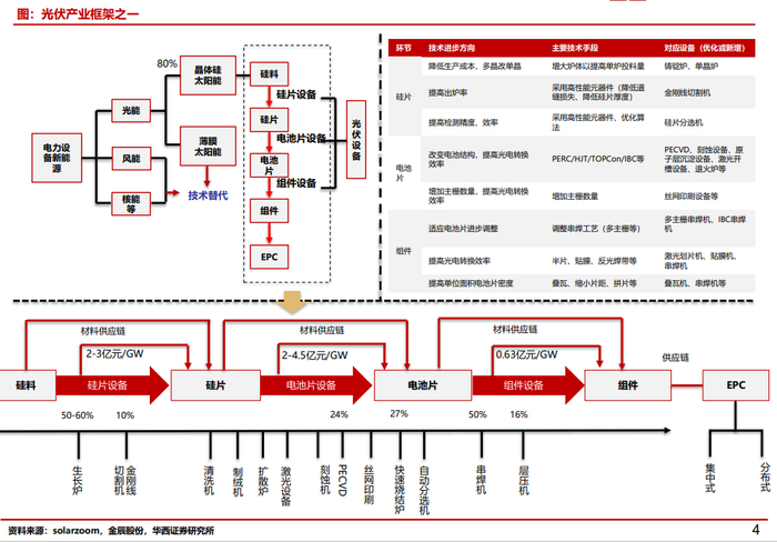 浙商证券指出,当前光伏各产业链环节,技术、管理、资本领先企业加速扩产,市场份额持续向头部集中,马太效应凸显。同时,由于产业链各环节技术仍在持续创新优化,技术领先企业有望获得加速发展机遇。主产业链分环节看,硅料:供需仍偏紧,价格有望保持高位;硅片:尺寸大型化趋势明确,隆基、中环寡头垄断;电池:TOPCon/HIT蓄势待发,竞争格局有望持续改善;组件:集中度持续提升,盈利水平有望修复。辅产业链方面,行业高增+渗透率提升,逆变器、支架等大有可为。