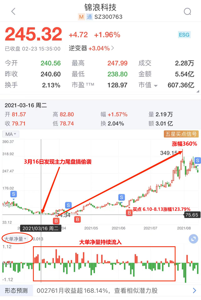 6月10日和8月13日,B/S点也发出了提示信号,锦浪科技从113.45元涨至253.88元,区间涨幅为123.79%。