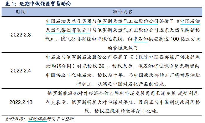 俄罗斯是一个资源型国家,与欧盟的矛盾升级之后,中俄的能源合作有望一定程度加深。中国是俄重要的能源出口方向,2020年日均出口的500万桶石油(含凝析油)中,有100-200万桶流向中国,2021年从俄罗斯进口原油约占总进口量15%,同时我国也是俄罗斯在亚洲地区最大的天然气出口国。俄罗斯在减少流向欧洲的能源同时,有望增加对我国的能源出口,但存在基础设施方面的不确定性。此前,中俄签订天然气大单,宣布在承诺的自2019年未来30年每年向中国输送380亿立方米的天然气(第一年输送50亿立方米,逐渐达到380亿立方米)基础上再增加100亿立方米;俄罗斯官方也曾表示未来对中国煤炭出口要由现在的约5300万吨增加达到1亿吨。信达证券认为这个量受制于基础设施问题并非马上可以实现的。因为俄罗斯的能源出口一直采取“东张西望”的布局,欧洲已经较为完善的天然气运输消费系统,东部的发展还在起步阶段。中俄的天然气供需渠道有两个,一个是天然气东线管道,设计输气产能380亿方,一个是北极大型LNG项目,约有400万吨LNG出口中国。长期看,中俄能源合作会更加密切,但还需要3-4年的基础设施建设时间。