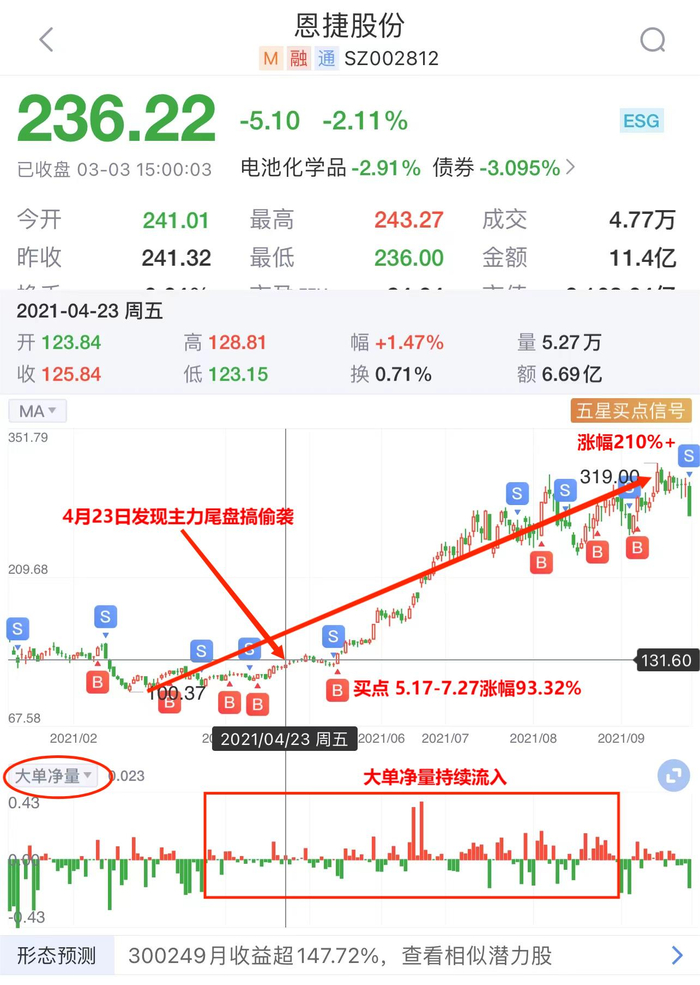 21年4月23日,尾盘掘金发现了主力潜伏恩捷股份的迹象,并在当天14点50分进行了异动提醒。同时,当天Level-2的大单净量也由流出变为了流入,这意味着有主力资金在行动。