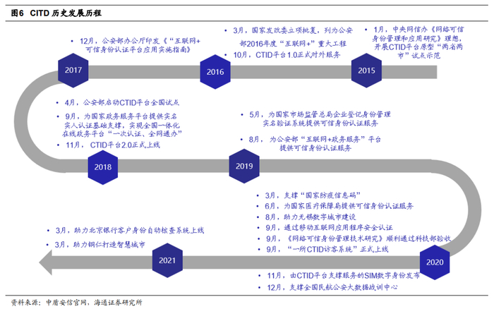 从更早的时间维度来看,电子身份证的推出其实已经蓄势已久了。数字身份证是“互联网+”可信身份认证平台(CTID平台)的基础应用之一。CTID平台是为支撑国家“互联网+”行动计划,在中央网信办、国家发改委和科技部的支持指导下,公安部领导下组织建设的“互联网+”重大工程基础保障类项目。2016年10月CTID平台1.0上线。2017年10月,公安部第一研究所授权中盾安信为CTID平台唯一合法的运营服务商。2018年4月,公安部启动CTID平台全国范围试点。2018年11月,CTID2.0上线。2019年起,CTID平台先后为国家移民管理局、国家市场监督总局、公安部、国家医疗保障局等提供可信身份认证服务。