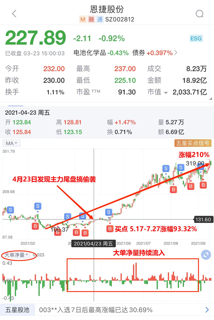 21年4月23日,尾盘掘金发现了主力潜伏恩捷股份的迹象,并在当天14点50分进行了异动提醒。同时,当天Level-2的大单净量也由流出变为了流入,这意味着有主力资金在行动。