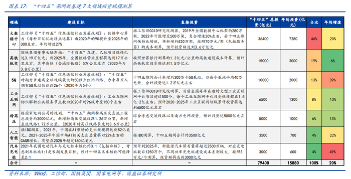 新基建在“十四五”期间年均增速约20%,年均体量1.6万亿左右,约为基建投资的10%。其中,特高压的“十四五”总投资为5000亿元,年均投资总额为1000亿元,占比为6%,年均增速为13%。