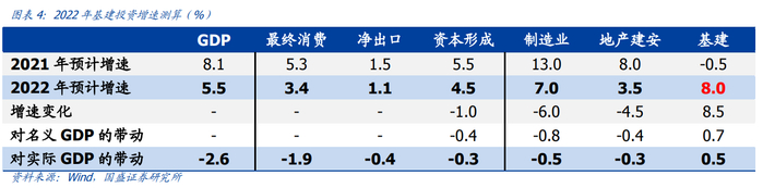 国盛证券指出,2022年稳增长需要基建发力已是共识,但基建的回升幅度和发力方向仍有分歧。在消费复苏、出口下行但有韧性,地产回落但仍小幅正增长的假设下,要完成2022年5.5%的目标增速,可能需要2022年基建投资增速达到8%左右(市场中性预期5-7%)。结构上,新老基建将共同发力。