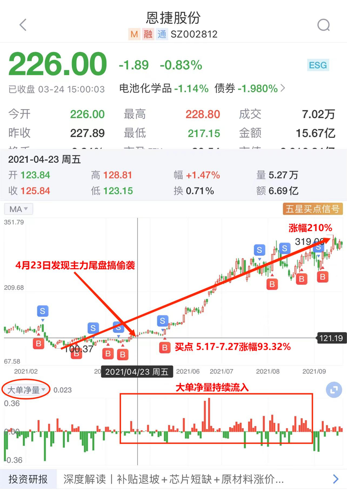 4月23日,尾盘掘金发现了主力潜伏恩捷股份的迹象,并在当天14点50分进行了异动提醒。同时,当天Level-2的大单净量也由流出变为了流入,这意味着有主力资金在行动。