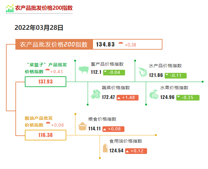 据农业农村部“全国农产品批发市场价格信息系统”监测:2022年3月28日,农产品批发价格200指数为134.83,比上周五上升0.67个点,“菜篮子”产品批发价格指数为137.93,比上周五上升0.77个点。