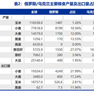 俄罗斯、乌克兰是世界重要小麦、大麦、葵花籽主要生产国和出口国,两国合计小麦、大麦、葵花籽产量分别占世界总产量14.3%、19.0%、55.7%。小麦、大麦、玉米出口量分别占世界总出口量33%、30%、20%(2021年)。中国从乌克兰进口玉米量占进口总量29%。