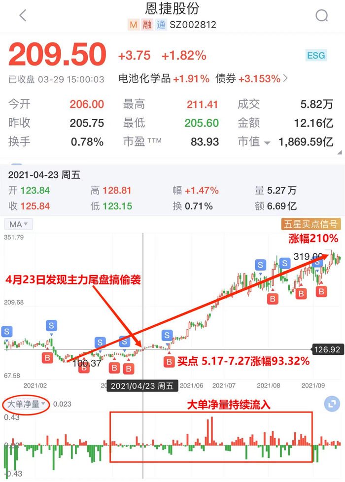 21年4月23日,尾盘掘金发现了主力潜伏恩捷股份的迹象,并在当天14点50分进行了异动提醒。同时,当天Level-2的大单净量也由流出变为了流入,这意味着有主力资金在行动。