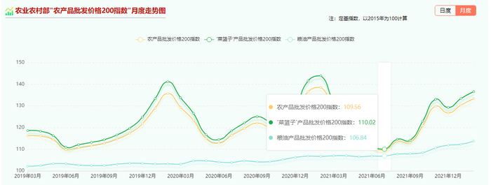 从2021年6月以来的走势图可以看出,农产品批发价格200指数和“菜篮子”产品批发价格200指数,分别从109.56和110.02涨至134.83和137.93,涨幅分别为23.06%和25.37%。另外,粮油产品批发价格200指数也从106.84涨至116.38,涨幅为8.93%。