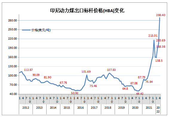 据印度尼西亚能源与矿产资源部最新发布的消息,2022年4月份,印尼动力煤标杆价继续大幅上涨,价格高达288.4美元/吨,折合人民币1834.54元/吨。环比3月份的203.69美元/吨上升84.71美元/吨,涨幅41.59%;比上年同期的86.68美元/吨上涨201.72美元/吨,同比上升232.72%,又再一次创出历史空前新高。