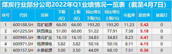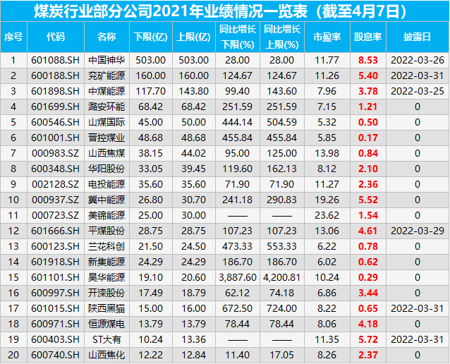 不仅是2021年的年报业绩喜人,2022第一季度的业绩继续大幅增长,兖矿能源预增193.20%为66亿元,陕西煤业预增51.22%-77.91%为51-60亿元。