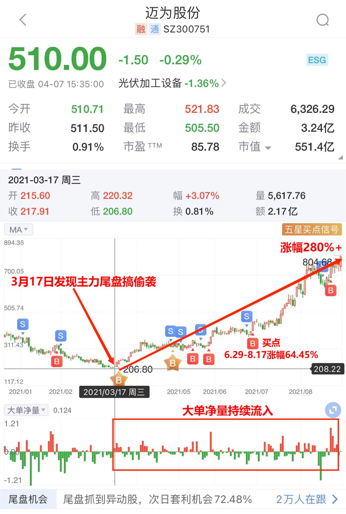 21年3月17日,尾盘掘金发现了主力潜伏迈为股份的迹象,并在当天14点50分进行了异动提醒。同时,Level-2大单净量的数据显示,3月17日当天,大单净量数据从持续流出变为了净流入。次日,迈为股份暴涨9.73%,第3天,再次大涨4.31%,2天累计暴涨14.46%。