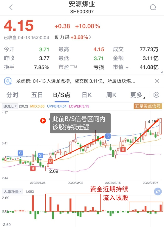 以今日大涨的安源煤业为例,通过新浪财经Level-2的大单净量发现,此前 ,主力资金持续流入该股,B/S点区间该股持续大涨。而近期,B/S点信号再度发出,至今该股已大涨18%,主力资金也再度涌入该股,意味着该股近期的再度获得资金的关注。