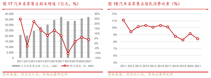 其实,除了通过基建投资来拉动经济之外,另一个稳增长的抓手就是消费。汽车在居民消费中占比较高,对拉动经济增长作用明显。根据统计局数据,2021年我国汽车类零售总额达3.7万亿元,同比+3.6%,占我国居民消费支出比重为8.4%,同比-0.7pct,近十年来汽车消费占居民消费支出的比重稳定在8.3%-11.1%之间,对拉动消费及经济增长作用明显。