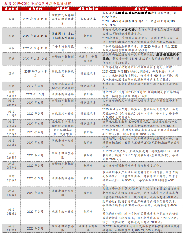 3)2020年的新能源汽车免征购置税及补贴期限延长,叠加二手车征税改革、老旧汽车报废更新补贴、放宽限购等政策。