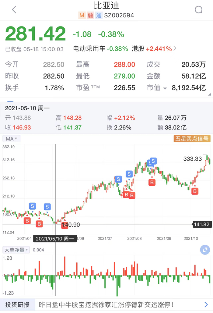 5月19日和7月15日,B/S点也发出了提示信号,比亚迪从158.7元涨至236.4元,区间涨幅为48.96%。