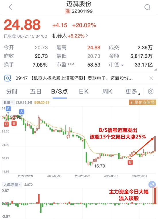以今日大涨的迈赫股份为例,通过新浪财经Level-2的大单净量发现,今日大笔主力资金涌入该股,并且在B/S点信号再度发出,随后该股在13个交易日里大涨25%,意味着该股近期获得资金关注。