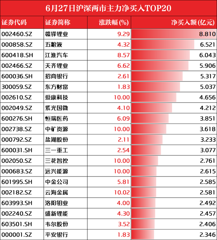 盘后数据显示,沪深两市主力资金今日小幅净流出18.67亿元,其中主力大手笔加仓赣锋锂业8.8亿元,五粮液、江淮汽车、天齐锂业分别获主力买入超过6亿元,招商银行、东方财富、爱康科技、紫光国微等多股获主力增持。