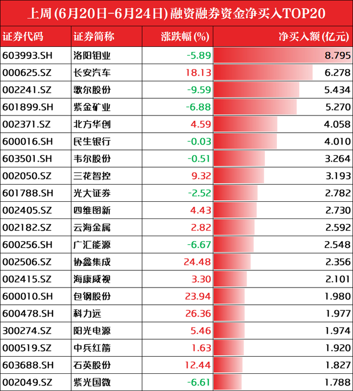 此外,杠杆资金上周大手笔加仓洛阳钼业,净买入额达8.80亿元,长安汽车获杠杆资金买入6.28亿元,歌尔股份、紫金矿业、北方华创、民生银行获杠杆资金青睐。
