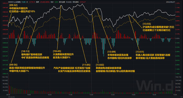 6月27日,两市早盘高开高走,沪指、创指盘中一度涨超1%,大消费板块走强。午后三大指数一度快速回落,创指盘中转跌,沪指、深成指涨幅收窄,随后再度震荡回升。截至收盘,沪指涨0.88%,深成指涨1.1%,创指涨0.22%,两市成交额再破万亿,北向资金大幅流入超72亿元。总体而言,市场情绪已明显改善,高低切换继续,个股涨多跌少,赚钱效应较好。