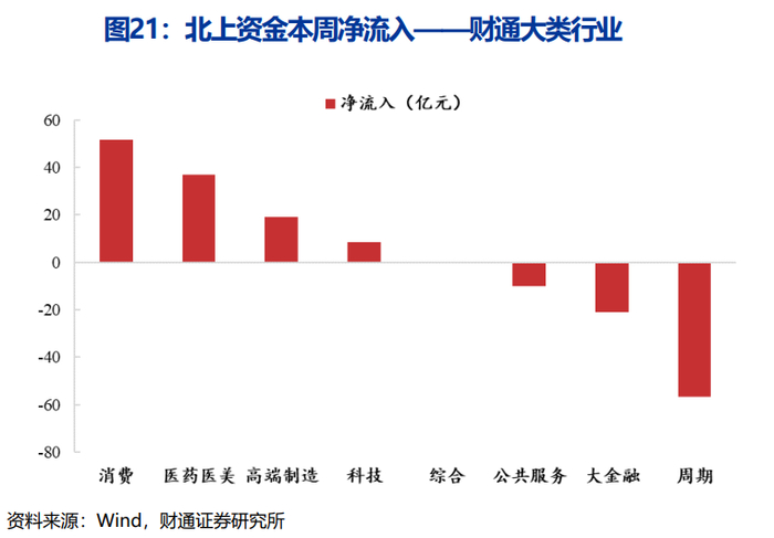 除此之外,根据财通证券的统计,北向资金上周流向分化,消费仍然是外资流入最多的行业,当周流入金额高达52亿元。