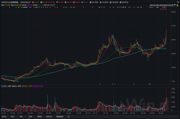 值得一提的是,金刚玻璃今日放量大涨,连续2日斩获20CM涨停,近4个交易日累计涨超70%,最新收盘价报62.20元/股。若从21年初的低点开始计算,公司股价已较前期低点实现超过900%的涨幅。若公司股价明日再度涨超8%,即可上演十倍大牛股的奇迹。