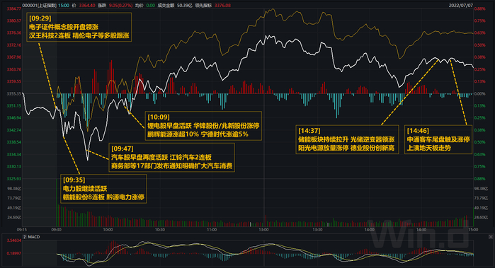 7月7日,A股市场三大指数开盘涨跌不一,盘中沪指成功翻红,深成指、创指涨幅双双扩大至1%,午后两市延续红盘整理。截至收盘,沪指小幅收涨0.27%,深成指涨0.97%,创指大涨1.68%,北向资金全天净买入5.54亿元,两市成交额连续第11个交易日突破万亿。总体上,市场多空博弈激烈,题材轮动加快。