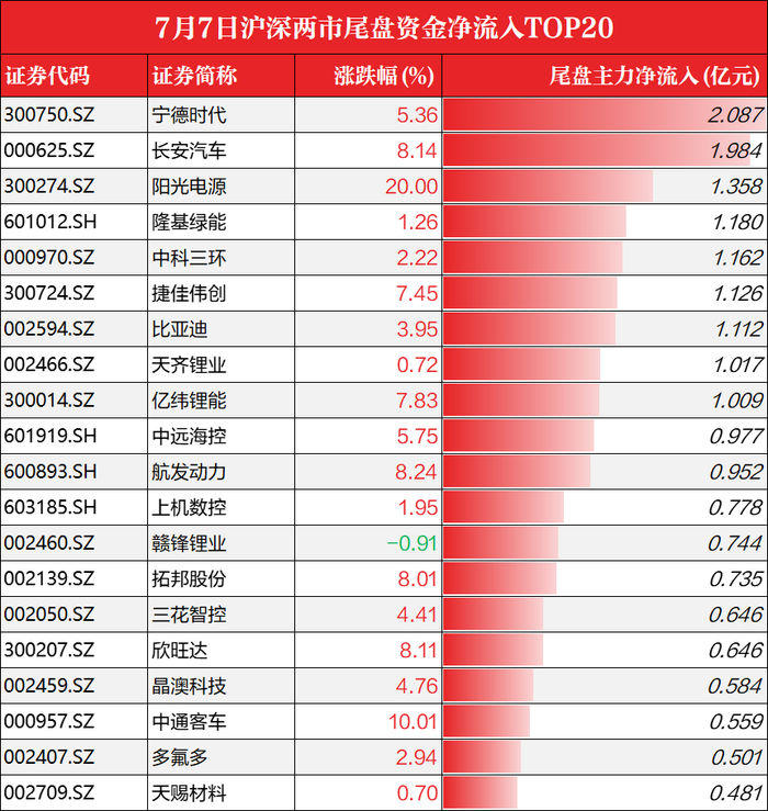 此外,沪深两市主力资金尾盘阶段快速流入逾38亿元,其中分别买入宁德时代、长安汽车约2亿元。