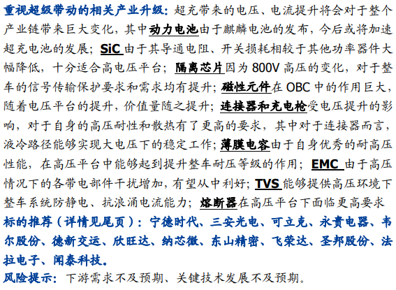 从技术路线来看,快充的核心在于提高整车充电功率,主要包括加大充电电流、提高充电电压两种方式。目前高压系统以低成本和高效率系统获得众多集团和品牌青睐,海外大众+奔驰+宝马等,国内比亚迪+吉利+极狐+现代+广汽+小鹏等均重点布局大电压平台电车。国盛证券表示,超充带来的电压/电流提升将对产业链带来巨大变化,重视超充带动的相关产业升级。