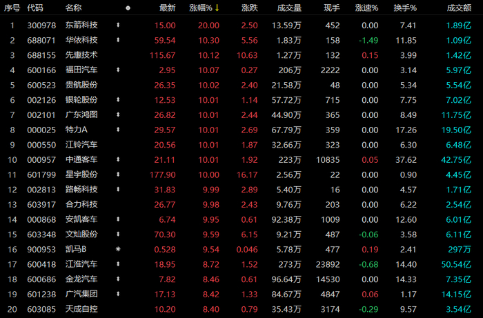 盘面上,汽车整车、电子证照、绿色电力等板块涨幅居前。具体来看,盘前突发利好政策刺激下,汽车产业链今天再度上演集体爆发,创业板东箭科技20CM涨停,福田汽车、贵航股份、银轮股份、广东鸿图、中通客车等多股涨停,江淮汽车、广汽集团、长安汽车大涨逾8%。