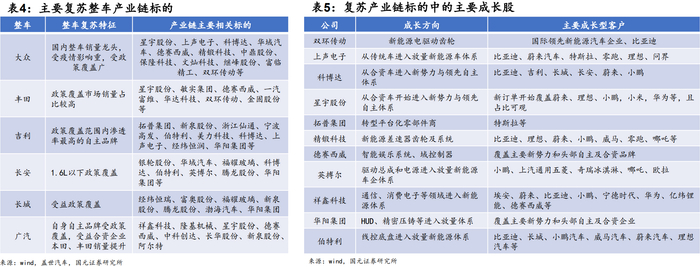 ①整车重点看好车型周期+稳增长政策推动下销量及盈利向上弹性,推荐长安汽车、比亚迪、长城汽车、广汽集团;