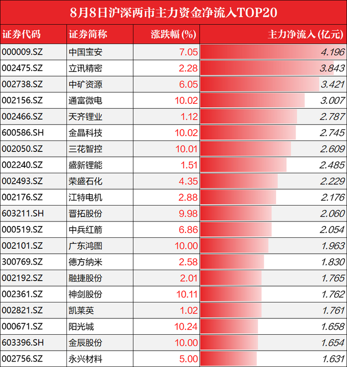 盘后数据显示,沪深两市全天净流出69.20亿元,其中能源金属获主力买入13.10亿元,汽零、电池、电力等板块获增仓。个股层面,中国宝安获主力买入4.20亿元,金额两市居首。立讯精密、中矿资源、通富微电等多股获增仓。