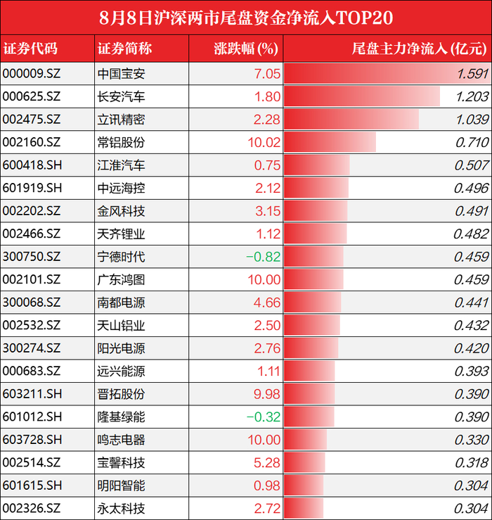 此外,尾盘阶段主力资金逆势流入19.26亿元,重点抢筹中国宝安、长安汽车、立讯精密,买入金额分别为1.59亿元、1.20亿元、1.04亿元。