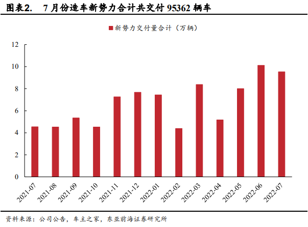 与此同时,政策方面,7月29日召开的国务院常务会议提出,延续免征新能源汽车购置税政策,从政策方面保障新能源汽车的发展。此外,下半年新势力车企多款车型或将上市,蔚来ES7/蔚来ET5/理想L9/小鹏G9/零跑C01/哪吒S/问界M5e有望陆续交付。东亚前海证券认为,随着政策持续保障新能源汽车发展以及新车型不断推出,新势力车企需求端与供给端均保持良性发展,下半年发展确定性依然较高。