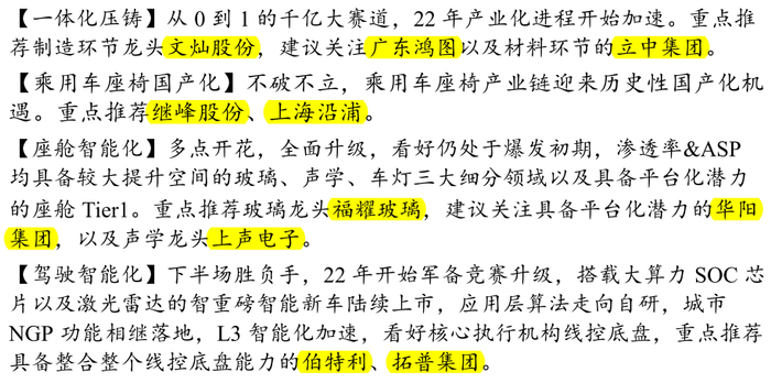 另一方面,铝/铜等大宗3月以来价格持续下跌,均创下近一年新低,下半年产销恢复+成本下降下板块基本面将迎来确定性复苏,从行业景气到行业基本面都是确定性复苏,支撑行情向上,聚焦一体化压铸+乘用车座椅国产化+座舱智能化+驾驶智能化: