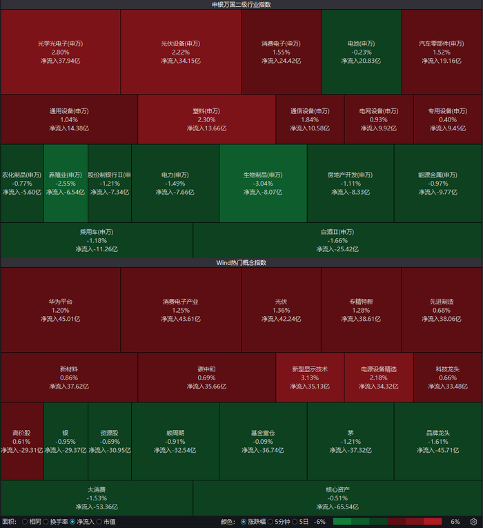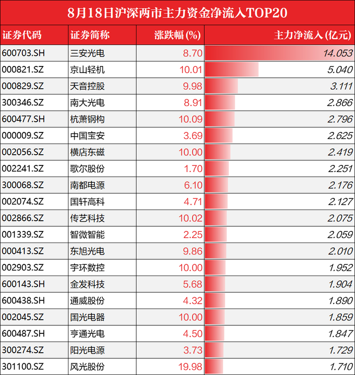 盘后数据显示,沪深两市主力资金全天净流出126.48亿元,其中光学光电子、消费电子等板块获大手笔加仓,买入金额分别为20.07亿元、12.39亿元。个股方面,主力资金抢筹三安光电逾14.05亿元,买入金额两市居首。京山轻机、天音控股、南大光电等股获买入。