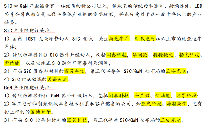 银河证券指出,随着特斯拉Model 3以及比亚迪相关车型选用SiC方案,SiC技术有望快速渗透。并且随着储能+高压快充+电动汽车+可再生能源对宽禁带包代替需求快速增长,英飞凌等功率器件厂商宣布对SiC衬底扩产。国内目前SiC导电型衬底方面的技术能力和产能规模不断增强,第三代半导体行业今年将迎来快速爆发元年,产业将呈现加速发展趋势。