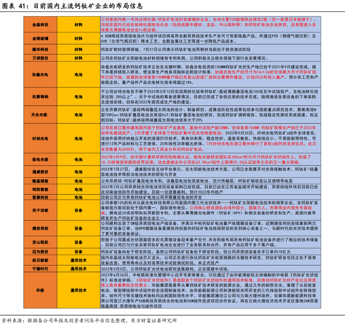 国泰君安表示,钙钛矿电池具有极高的光电转换效率上限,具备大规模商业化应用潜力。新式钙钛光伏电池单层理论效率可达33%,钙钛矿叠层电池转换效率可达43%。同时,钙钛矿电池产业链大幅缩短,制造效率显著提升,且单GW投资额有望大幅下降。东方财富证券认为,通过优化配方工艺和封装技术解决稳定性难题后,钙钛矿是下一个光伏产业α,有望出现类似于颗粒硅和磷酸铁锂对替代路线的超越。