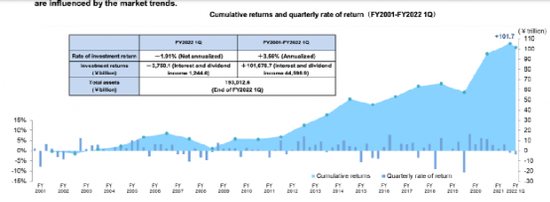 日本政府养老金投资基金也即全球最大的养老基金GPIF 2022年2季度(2022财年的1季度)现亏损。这也是GPIF过去两年来,表现最差的一个季度。