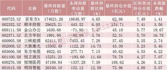 上周北向资金持仓市值增加额前十的股票中,除金山办公、北方华创、恒立液压、恒瑞医药被减仓外,其他股票均被加仓,其中对京东方A、三峡能源、大族激光的持股增加数超1100万股。