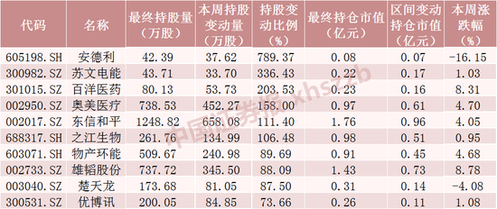 从持股量变动比例来看,Choice数据显示,上周北向资金对6只股票的持股增加超过1倍,其中对安德利、苏文电能、百洋医药妆持股增加比例居前,分别为789.37%、336.43%、203.53%。北向资金对安德利的持股量从4.77万股增至42.39万股。