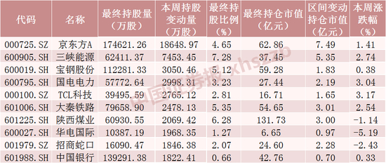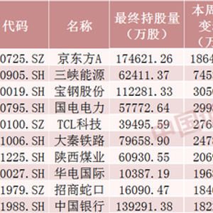 上周北向资金对京东方A持股增加数最多,增加了1.86亿股;对三峡能源、宝钢股份持股分别增加7453.45万股、3050.46万股。