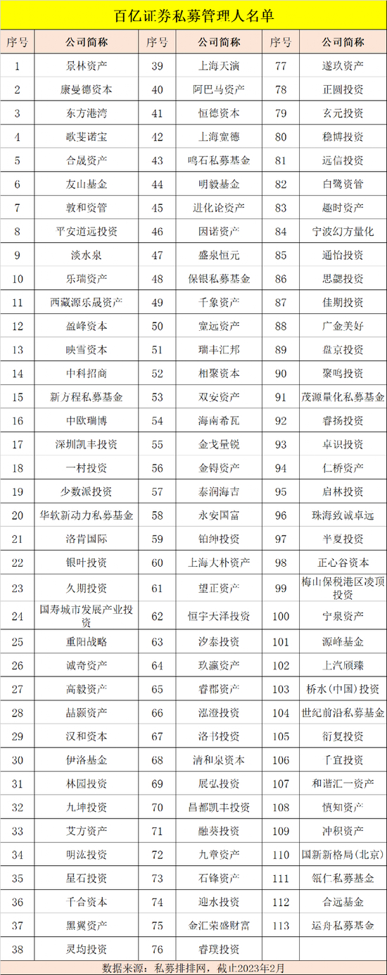私募排排网数据显示,截至今年2月,管理规模在100亿元以上的私募证券投资基金管理人达到113家。值得注意的是,本月新增了3家百亿私募机构,包括新晋跨入百亿私募的稳博投资、千宜投资,还有原“公募一哥”王亚伟的千合资本重回百亿阵营;同时也有两家私募掉出了百亿俱乐部,分别是复胜投资和旌安投资。