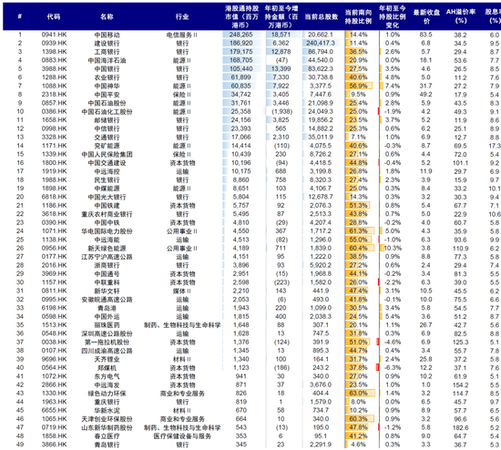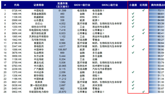 ►红利股与小盘股的局部“定价权”。我们统计了南向持股占比在30%以上个股,发现基本以小盘股(市值在50亿港币以下)和红利股为主。从2024年南向资金的持股结构上看,南向增持前15大个股中高分红标的占2/3。这一点同样也体现在AH溢价上,AH两地上市的公司中绝大多数均为国企和传统板块,其中金融、能源、电信、公用事业等板块市值占比约80%,历史上每一次南向的大举流入往往对应着AH溢价的快速回落。