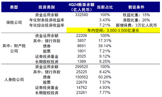 ►保险资金:若港股配置占权益投资比例提升至20%,空间约3,000-3,500亿港元。根据国家金融监管总局披露,截至2024年四季度保险业(含财险与寿险)股票与证券投资基金的投资总额4.1万亿人民币,占其资金运用余额33.3万亿人民币的12.4%,当前港股占权益类投资的比例约在15%左右。假设后续险资权益类资产占比小幅升至15%,且港股占比提升至20%,或带来2,000-2,500亿人民币增量资金。新增保费上,假设今年全年保费增量维持在3万亿人民币,权益类资产配置15%,港股占比20%,有望带来800-1,000亿人民币的增量资金。两者加总折合约3,500亿港元;