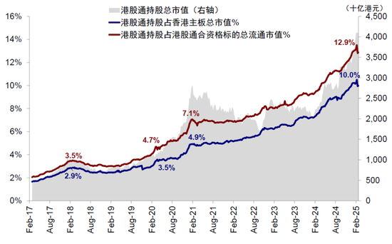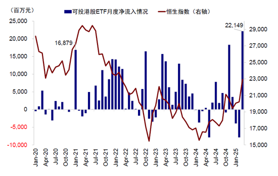 2024年12月中国社会科学院国家资产负债表研究中心发布的《中国国家资产负债表1978-2022》显示,截至2022年底居民部门投资股票总额约22.6万亿人民币。与此同时,2024年《上海证券交易所统计年鉴》显示,截至2023年,个人投资者持股总市值在100万人民币以下的比例22.5%。考虑到当前开通港股通交易权限仍有50万人民币的资金门槛,上述个人投资者有可能更多采用ETF配置,假设比例提升5%,有望带来2,500亿港元的流入。